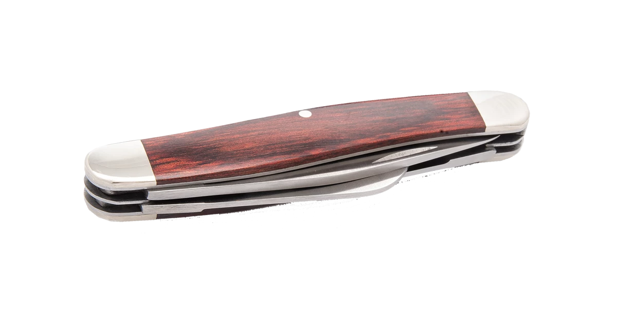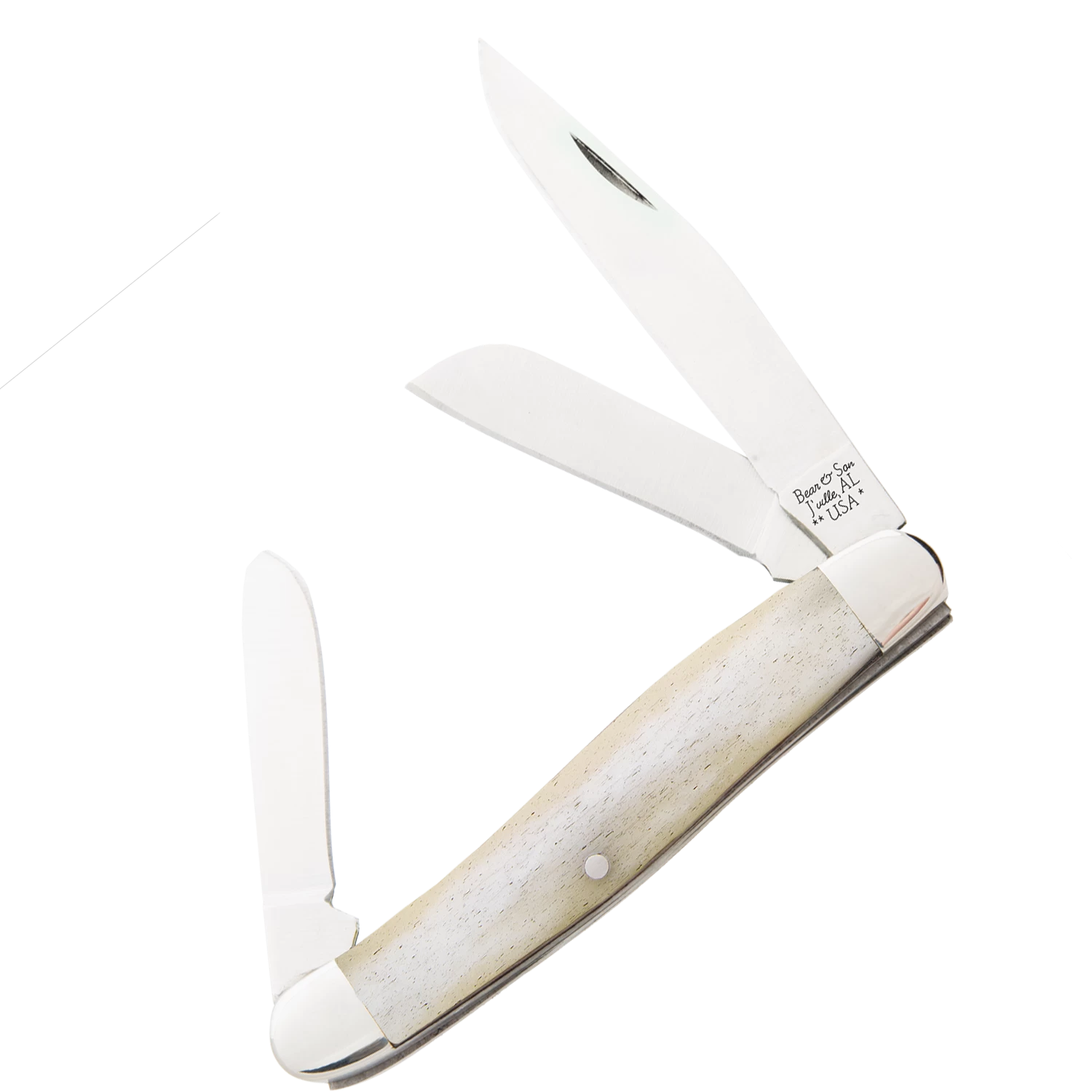 The Bear & Son 47 is a Large Stockman. The Hollow Ground 3″ Taper Ground Blade, Taper Ground 2-1/16″ Spey Blade and 2-1/8″ Sheepsfoot Blade are made from High Carbon Stainless Steel, making them rust resistant, easy to sharpen, and will hold an edge exceptionally well. The 47 is designed with Stainless Steel Liners and Nickel Silver Bolsters. The Bear & Son 47 has the traditional slip-joint lock that is easy to open and close and nail nicks are present to open the blades. The Bear & Son 47 has an overall length of 6-1/2″ and is perfect for those out on the ranch. 47 weighs 2.5 ounces.