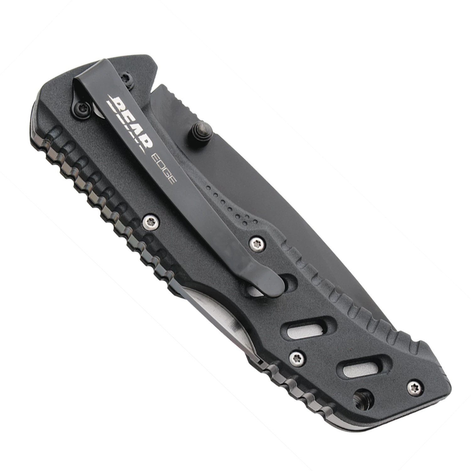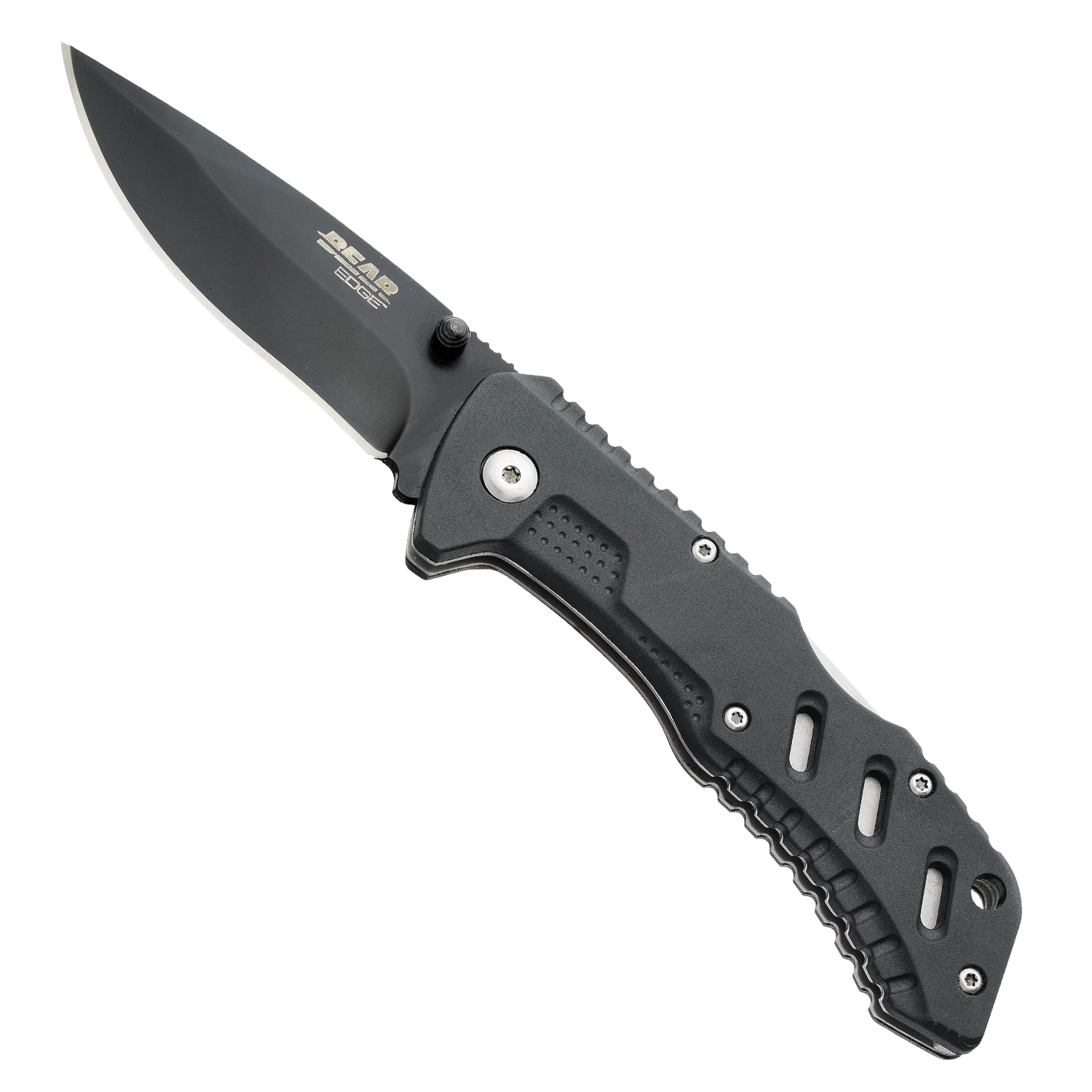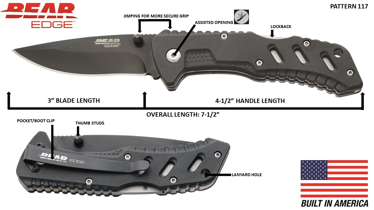 The Bear Edge® Pattern 117 is a USA built 4-1/2” Assisted Lockback. The Hollow Ground 3” Modified Drop Point Blade is made from 440 Stainless Steel with a Black Coating Finish to prevent rusting. The spring assistance along with pushing up on the Thumb Studs allow for a smooth and quick opening of the Bear Edge® Logo engraved blade. The Bear Edge® Pattern 117 features a positive lock that ensures the blade will remain firmly in place once opened and is easy to close with the press of the back lock. Jimping is present on the top of the blade and handle for a more secure grip. The Zytel Handle features a Bear Edge® engraved Pocket/Boot Clip for Tip-Down Carry. The Bear Edge® Pattern 117 has an overall length of 7-1/2″ and weighs 4.0 ounces. The Bear Edge® Pattern 117 also features a lanyard hole for secure fastening and storage.