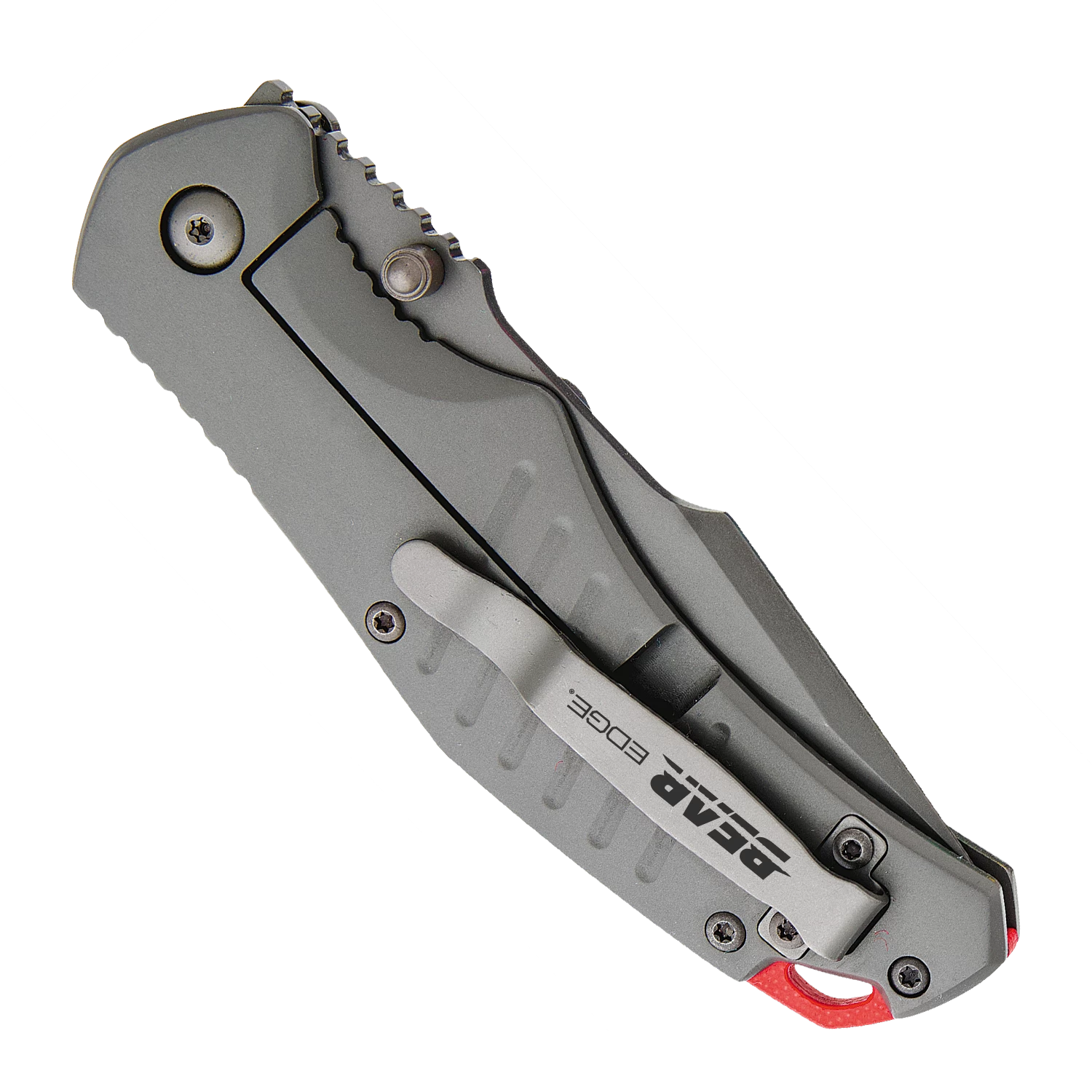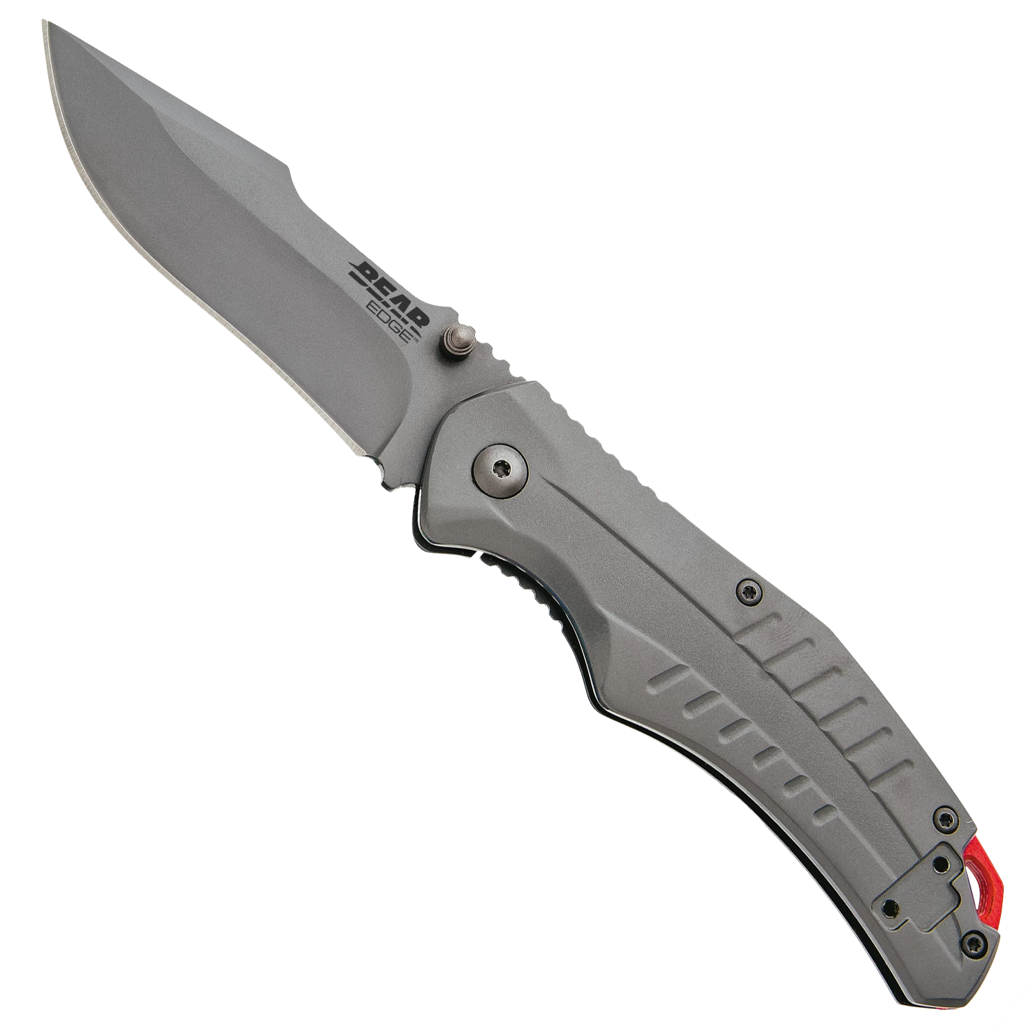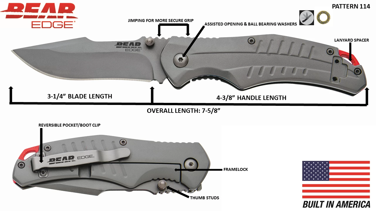 Pattern 114 is a USA built 4-3/8” Stainless Steel Framelock that is part of our Bear Edge® line and weighs 4.5 ounces. The 3-1/4” hollow ground blade is made with 440 High Carbon Stainless Steel with a bead blast finish to help prevent rust and is easy to sharpen. Pattern 114 is designed with thumb studs on the blade and smooth action ball bearing washers for quick and easy opening. The Bear Edge® logo is engraved on the blade and a lanyard spacer is present for secure fastening and storage. Jimping is present on the framelock, the top of the blade, and the top of the handle for a more secure grip. Pattern 114 features a Bear Edge® engraved reversible pocket/boot clip for tip-up carry for either left- or right-hand carry and quick access.