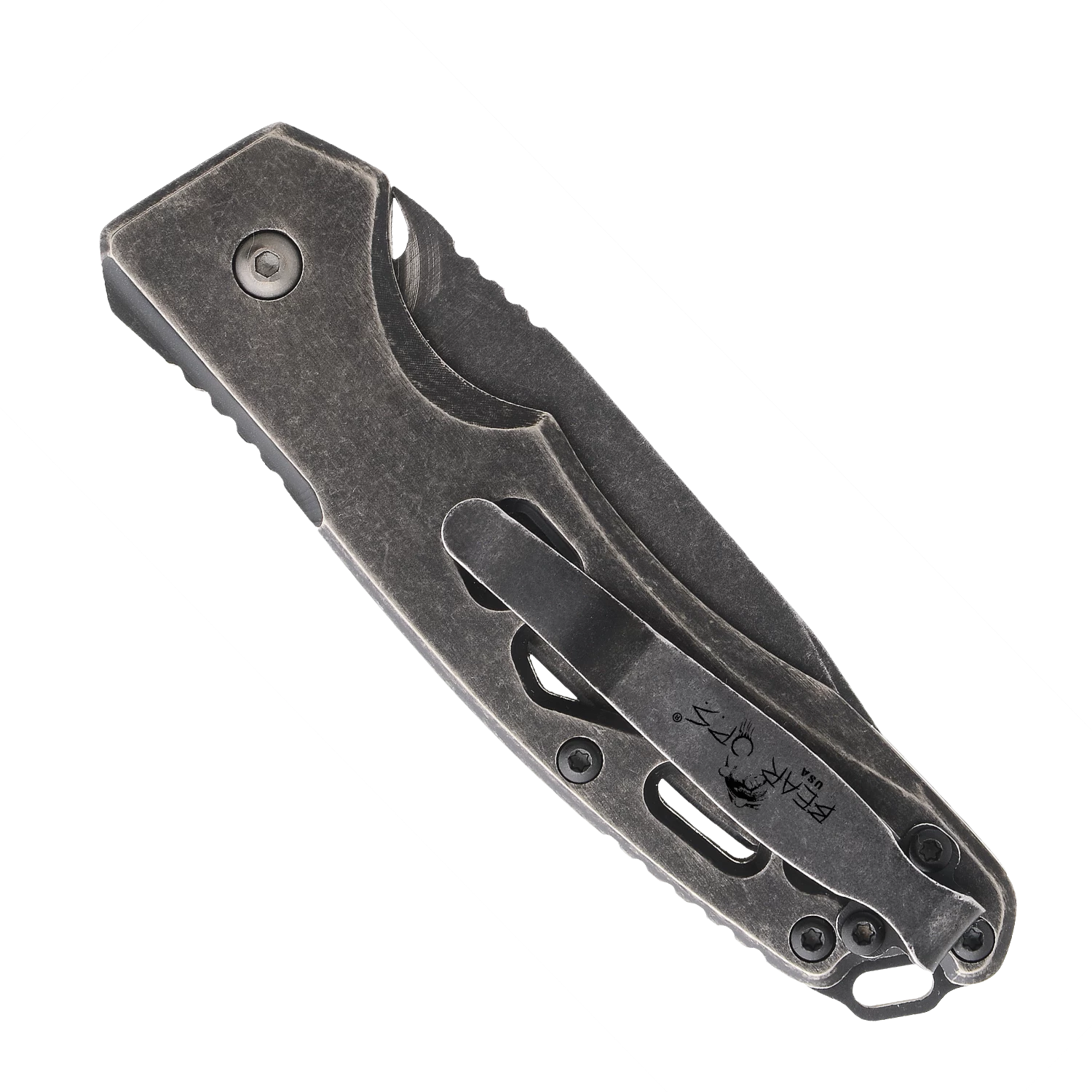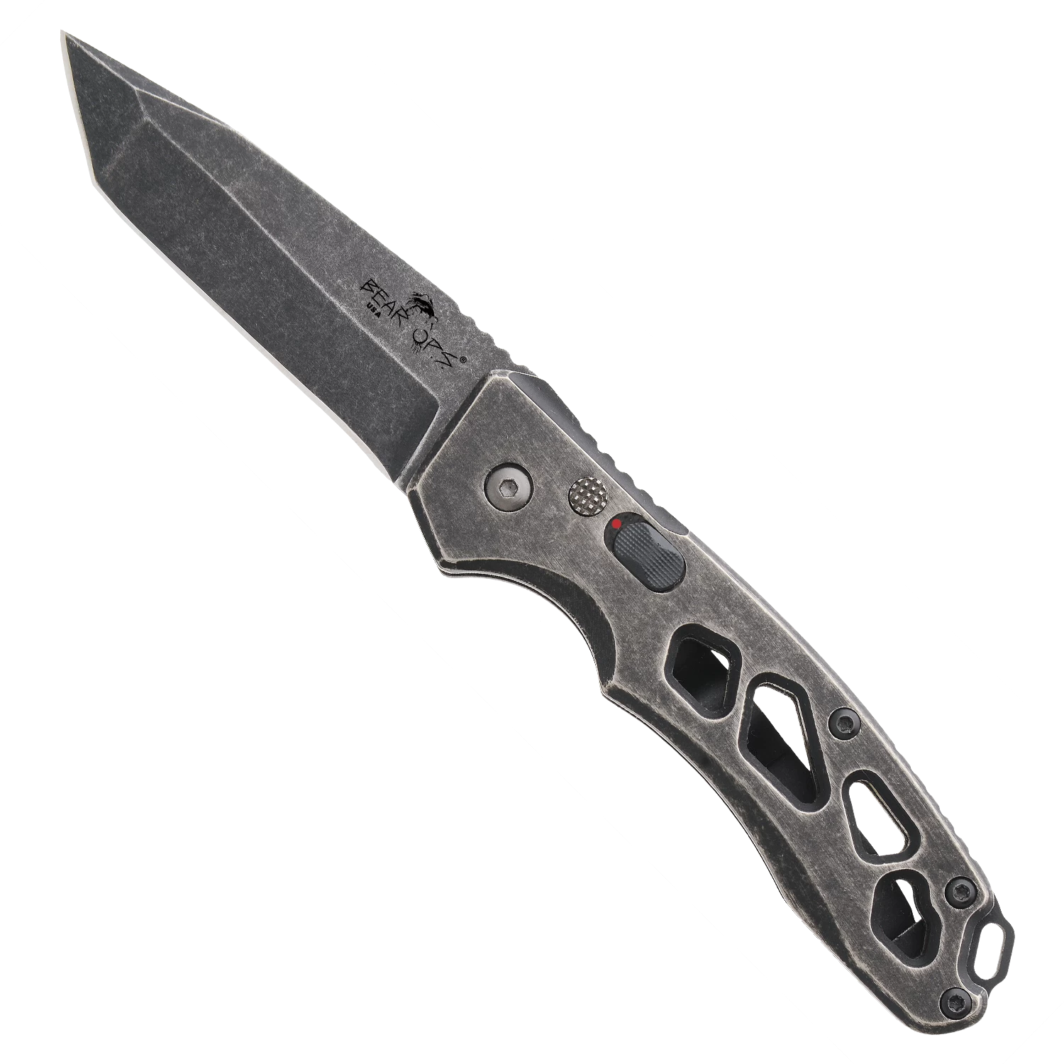 The Bear Ops AC-1200-Ti-SW is part of the Bold Action® XII series. The Modified Drop Point Bold Action® XII pattern features a Hollow Ground 2-7/8” blade edge that is made with 154CM Premium Steel, allowing this auto to be corrosion resistant and tough with a great edge retention. The blade opens with a firm push of the recess button and a safety is present to prevent accidental deployment. The Titanium Stonewash 4″ Handle features a Pocket Clip that provides for tip-up carry and quick access. The Bear Ops AC-1200-Ti-SW features jimping on the top of the blade and handle and an index finger groove for a more secure grip. A lanyard spacer is also present for fastening and secure storage. The Bear Ops AC-1200-Ti-SW has an overall length of 6-7/8″ and weighs only 2.8 ounces due to its skeletonized design. Bold Action® XII is proudly made in the USA.