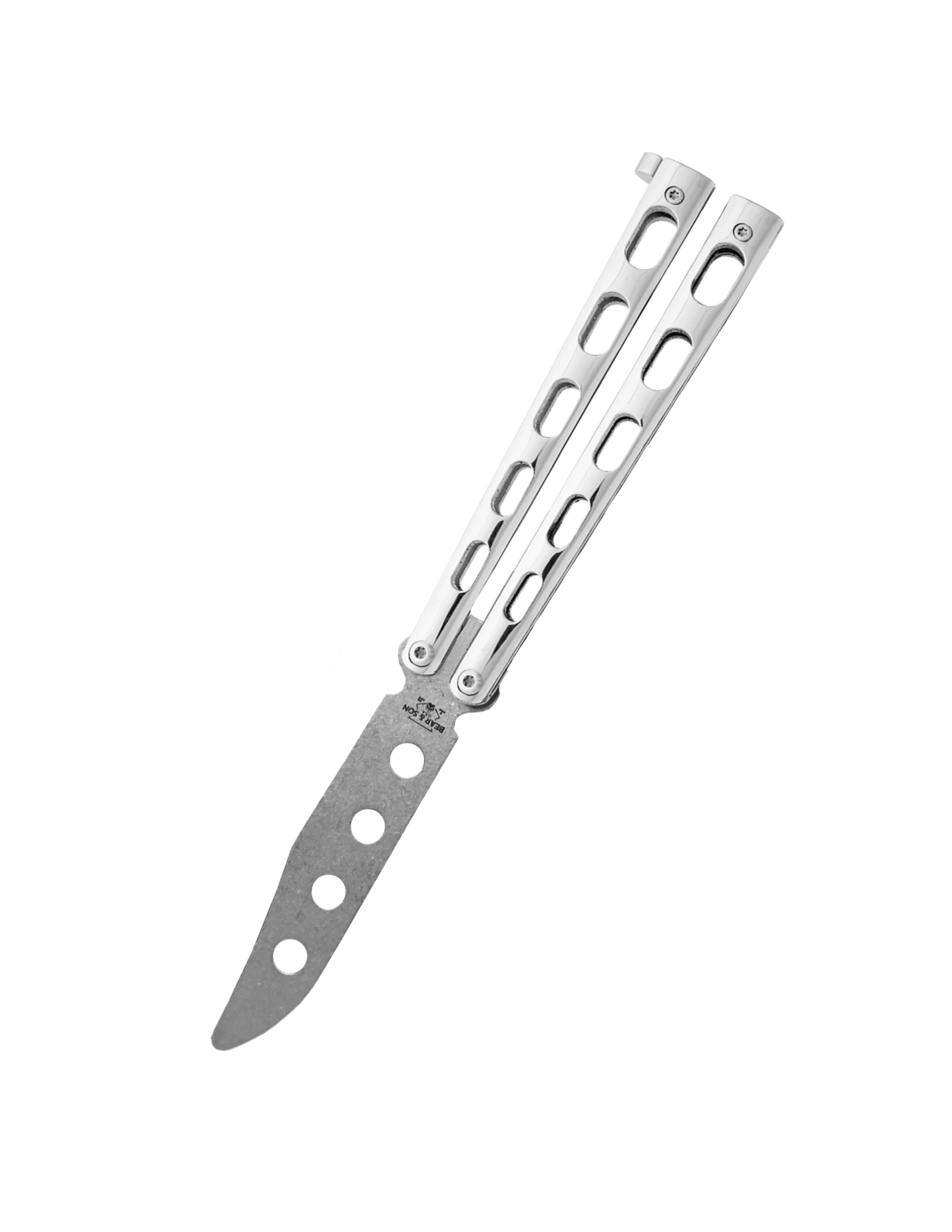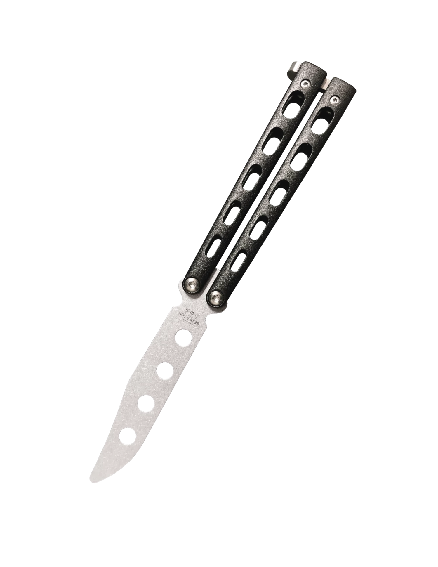 The Bear & Son 113TR is a Silver Vein 4″ Butterfly Trainer that is small and lightweight due to its skeletonized handles. The trainer blade has holes to simulate the feel of a real butterfly knife and is made from High Carbon Stainless Steel. The Bear & Son 113TR has a durable tang pin construction and weighs just 3.8 ounces. The overall length of this small butterfly is 7-1/2″ and features zinc handles with epoxy powder coating.