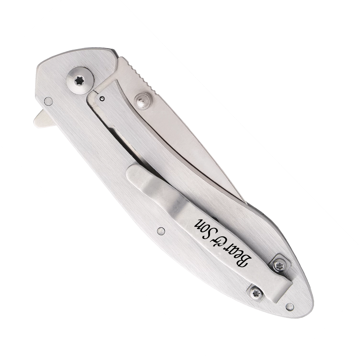 The Bear & Son 112 is an Executive Liner Lock that is constructed from 100% stainless steel. 112 features a 2-7/8″ Hollow Ground Blade that is made from High Carbon Stainless Steel, making this knife rust resistant, easy to sharpen, and holds an exceptional edge. The 112 weighs 2.4 ounce and features dual thumb studs for an easier opening and a frame lock to ensure that the blade remains firmly in place. A Bear & Son engraved pocket clip is added to its design that allows for a tip-up carry. This model is designed to be thin and lightweight for an everyday carry knife. The Bear & Son 112 has an overall length of 7″.