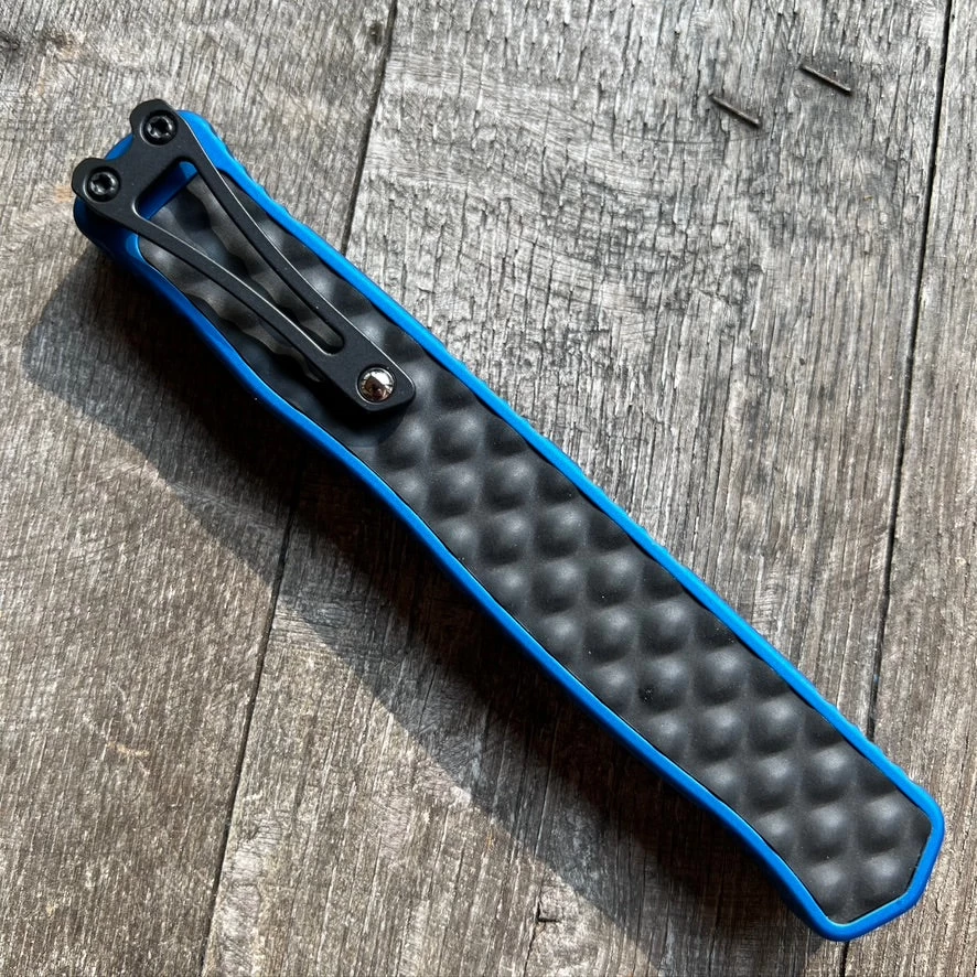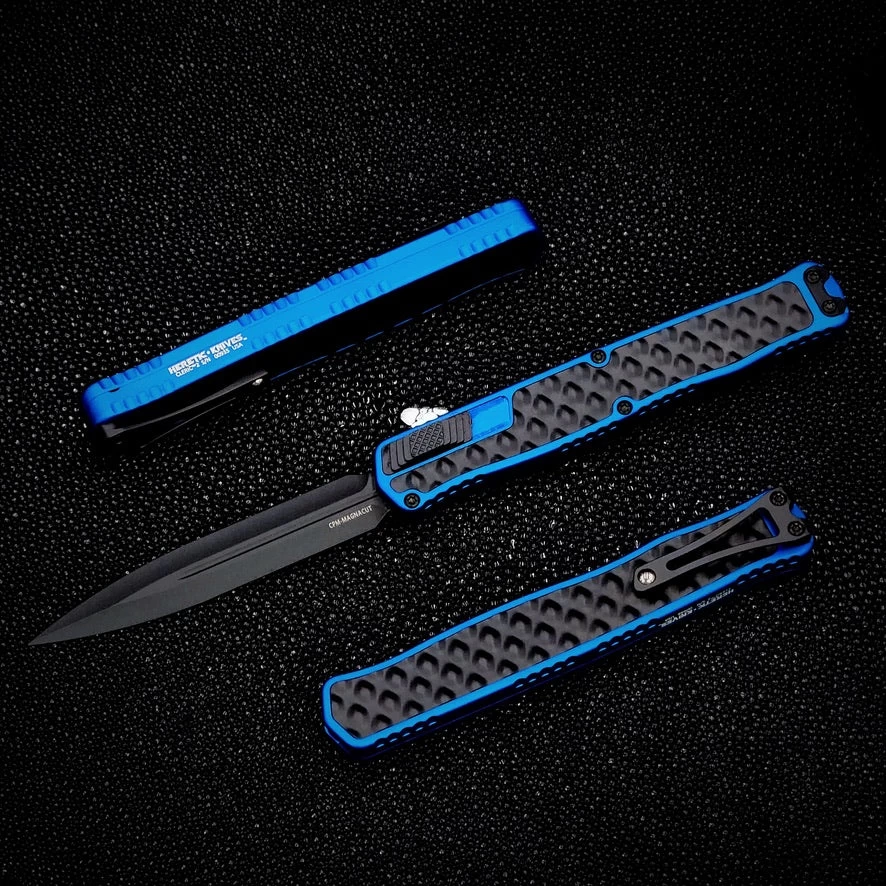 Heretic Cleric 2 OTF Auto- Double Edge Tactical- BLUE Handle- Textured Black Metal Inlay- Black DLC Plain Edge BladeH020-4A-BLU