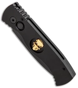 The TR (Tactical Response) series by Pro-Tech is one of many automatic knife models they offer that blends the finest materials available with a supreme commitment to craftsmanship. Each small hand-crafted batch is built with the most modern high-tech manufacturing practices from the standard production models to their highly sought-after custom knives. This side open auto model opens with incredible speed and showcases a rock-solid lockup and the multiple jimping locations promotes increased traction with any style grip. This model, the TR-2.66, features a black anodized aircraft aluminum handle with a Bruce Shaw designed solid sterling and gold skull inlay coupled with a spear point blade in a DLC (Diamond Like Carbon) black finish and the pocket clip is designed for tip up carry only. Made in the USA.