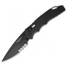 The Tactical Response 4 is a whole new take on Protech’s popular Tactical Response line. It incorporates a sliding safety on the front of the handle. This TR-4 features a 4″ DLC black CPM-D2 tool steel blade with a partially serrated cutting edge. The ergonomic handle is black anodized 6061-T6 aluminum. The TR-4 is a knife that will not let you down. It fires hard, locks up like a rock (what else would you expect from Pro-Tech?) and feels great. Black tip up carry pocket clip and lanyard loop. Also includes a black nylon sheath. Brand new in box.