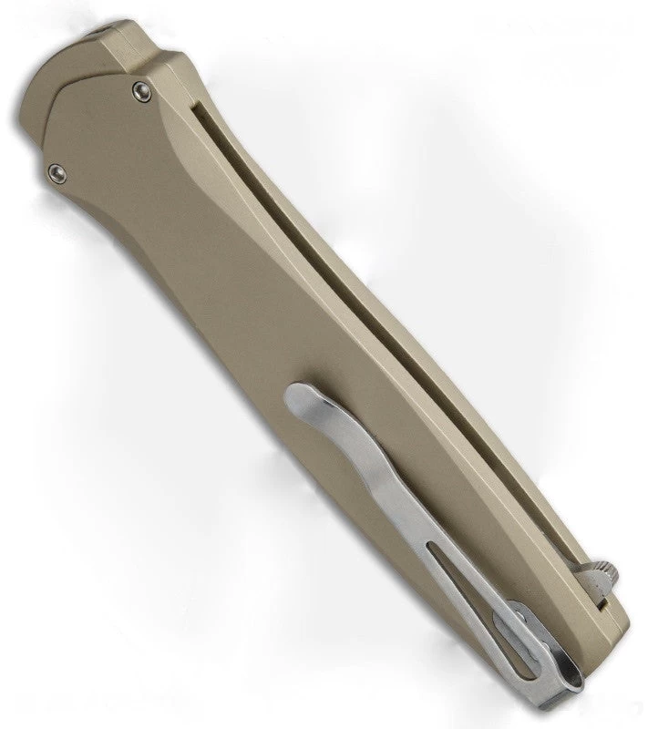The Dark Angel from Protech is a beautiful knife with a sleek look. This single action out-the-front knife has great action that is quick and controlled. The dagger blade has a double edge and a stone wash finish. The aluminum body is Desert Sand anodized. The Dark Angel also features a safety for added security and a pocket clip for carry. Includes durable nylon sheath. The Dark Angel is a fine collection piece!