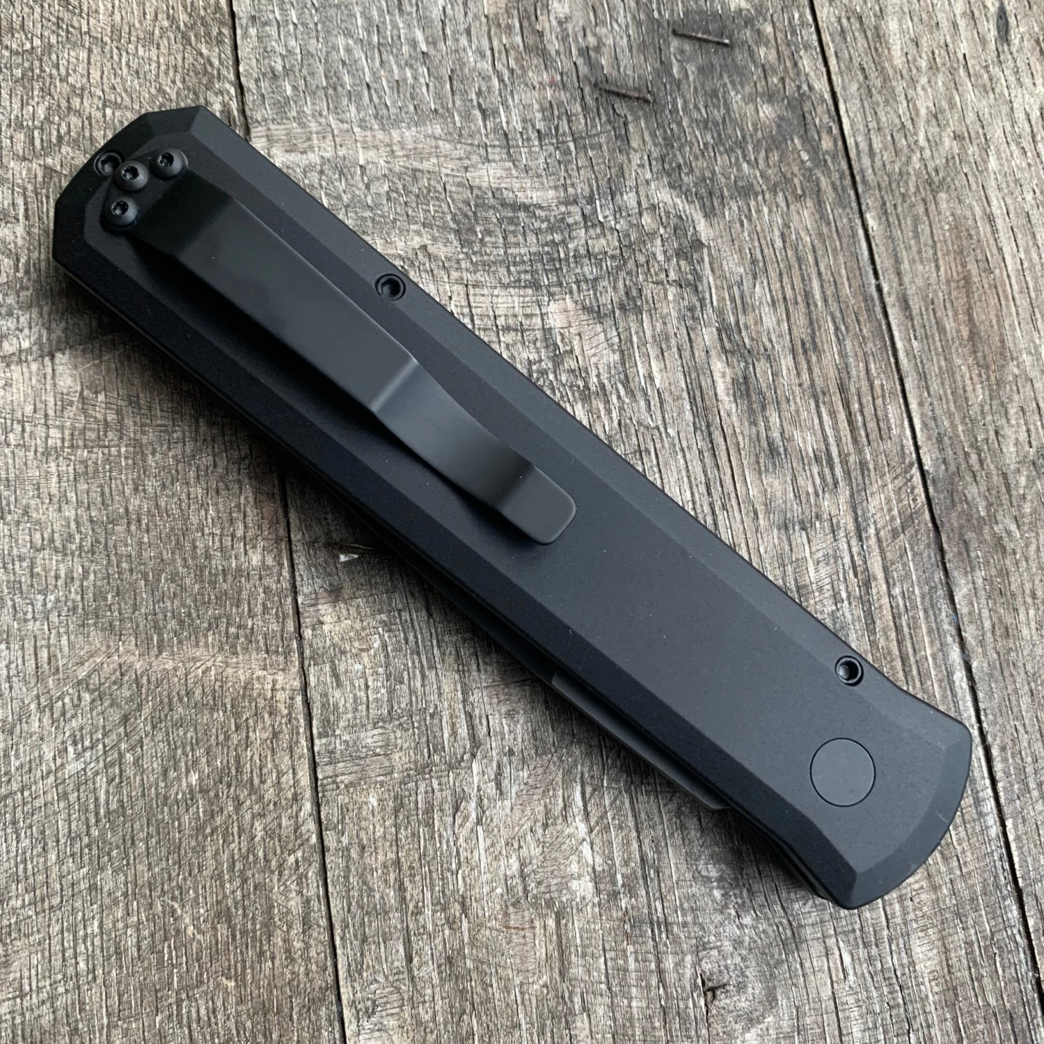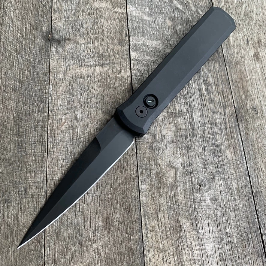 The Protech Knives Godfather is a classic automatic folder inspired by traditional Italian folding Stilettos. The Godfather is the American innovation of the automatic Stiletto featuring modern materials, high tech manufacturing, advanced coil spring mechanism, and quality American production. This “Operator” version has a sterile black DLC coated, plain edge blade, with matching hardware, black anodized aluminum handles and a tritium inlaid button.