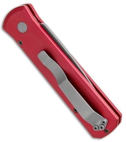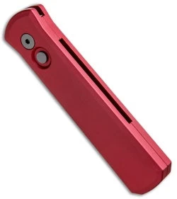 This Godson has a bead blast finished 154-CM blade with a plain edge. The handle is solid red anodized T6-6061 aluminum. Bead blast finished tip-up pocket clip for easy carry.