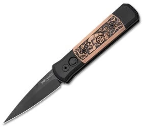 This limited edition Godson Steampunk from Protech is part of a limited run of 200 numbered knives. It features an impressive Bruce Shaw designed Steampunk copper inlay on front and a solid aluminum back side with a black coated pocket clip. The blade is black coated.