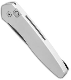 This Newport knife has an S35-VN steel blade with a black DLC finish. The silver anodized aluminum handle has satin hardware and a black tip-up carry pocket clip.