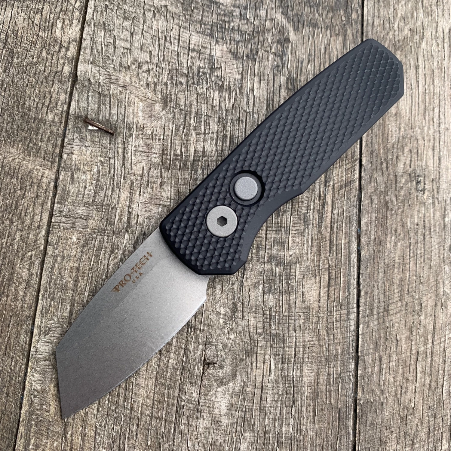 The ProTech R5205 Runt 5 – Reverse Tanto automatic knife is ProTech’s newest take on their classic Runt model. It features the superb opening action that ProTech is known for, and a sub-two-inch blade, making it legal in California. The handle is small, but well shaped to fit the human hand, making it comfortable to hold for precise cuts. The textured aluminum handle has a black finish. The Reverse Tanto type blade is CPM-20CV steel with a stonewash finish. Features blasted hardware and a black finish deep carry pocket clip.