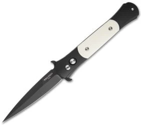 This Tuxedo style Don knife features a black finished blade and a black anodized aluminum handle with ivory Micarta inlays. The firing button and hardware are satin finished. Includes a black coated pocket clip.