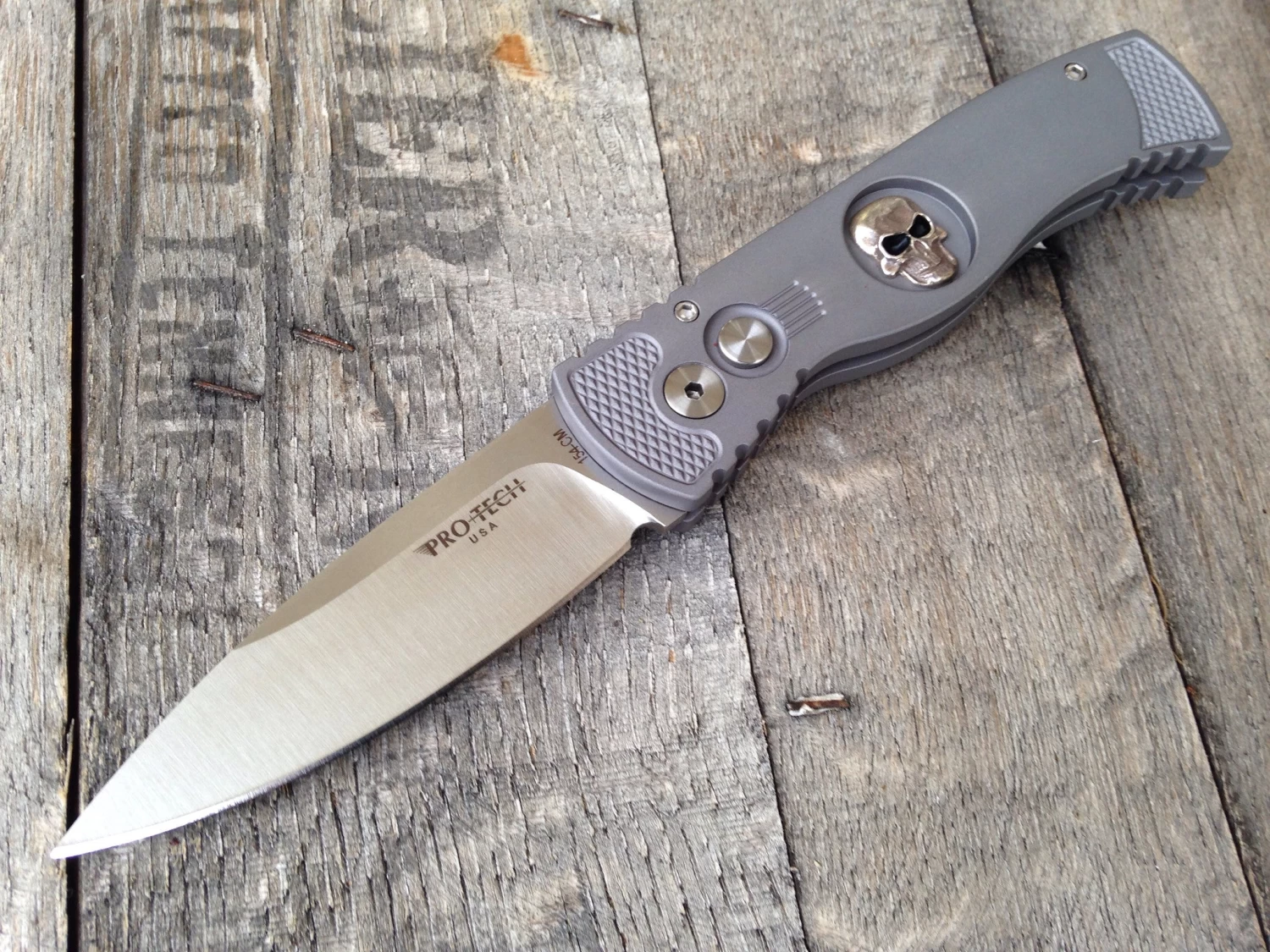 High value custom feel with this one. We love the weight and size of this knife for and EDC. This is a limited edition run TR-2 knife featuring a Bruce Shaw designed solid sterling silver skull that is set into the gray anodized aluminum handle. The stainless steel blade is satin finished. This knife, like all Protech knives, fires hard and feels great in hand. These knives are serial numbered on the handle, only 500 made!
