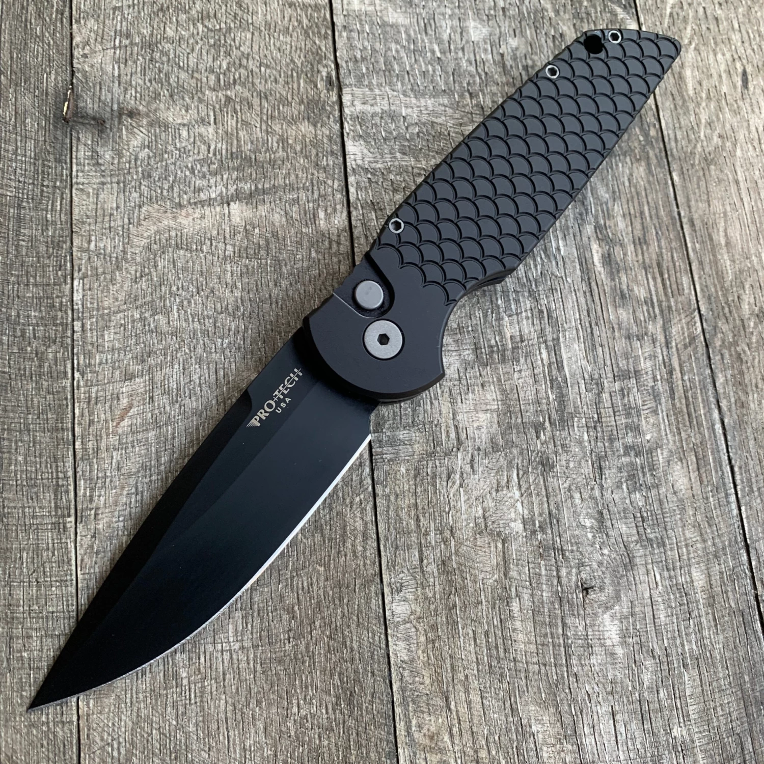 This Tactical Response TR-3 features a “Fish Scale” milled black anodized aluminum body for added traction, and a sliding safety for secure carry. The blade is black finished 154-CM stainless steel with a plain cutting edge. The TR-3 is a knife that won’t let you down. It fires hard, locks up like a rock, and feels great in hand. The slim design sits comfortably for tip-up pocket carry.