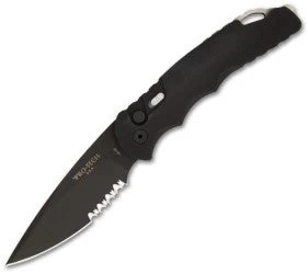 The TR-4 is a whole new take on Protech’s popular Tactical Response line. It incorporates a much requested sliding safety on the front of the handle. This TR-4 features a 4″ black DLC finished 154-CM steel blade with a partially serrated edge. The ergonomic handle is black anodized T6 aluminum. The TR-4 is a knife that will not let you down. It fires hard, locks up like a rock (what else would you expect from Pro-Tech?) and feel great. The TR-4 has a pocket clip (tip up) on the back of the knife for easy carry. Also includes a black nylon sheath.