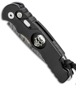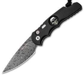 This TR-5 automatic model has a black anodized aluminum handle with a Bruce Shaw designed sterling skull inlay, mother of pearl push button, and a deep carry tip-up pocket clip. Its blade is made from Chad Nichols stainless damascus steel. A sliding safety lock allows secure pocket carry and prevents accidental blade deployment.