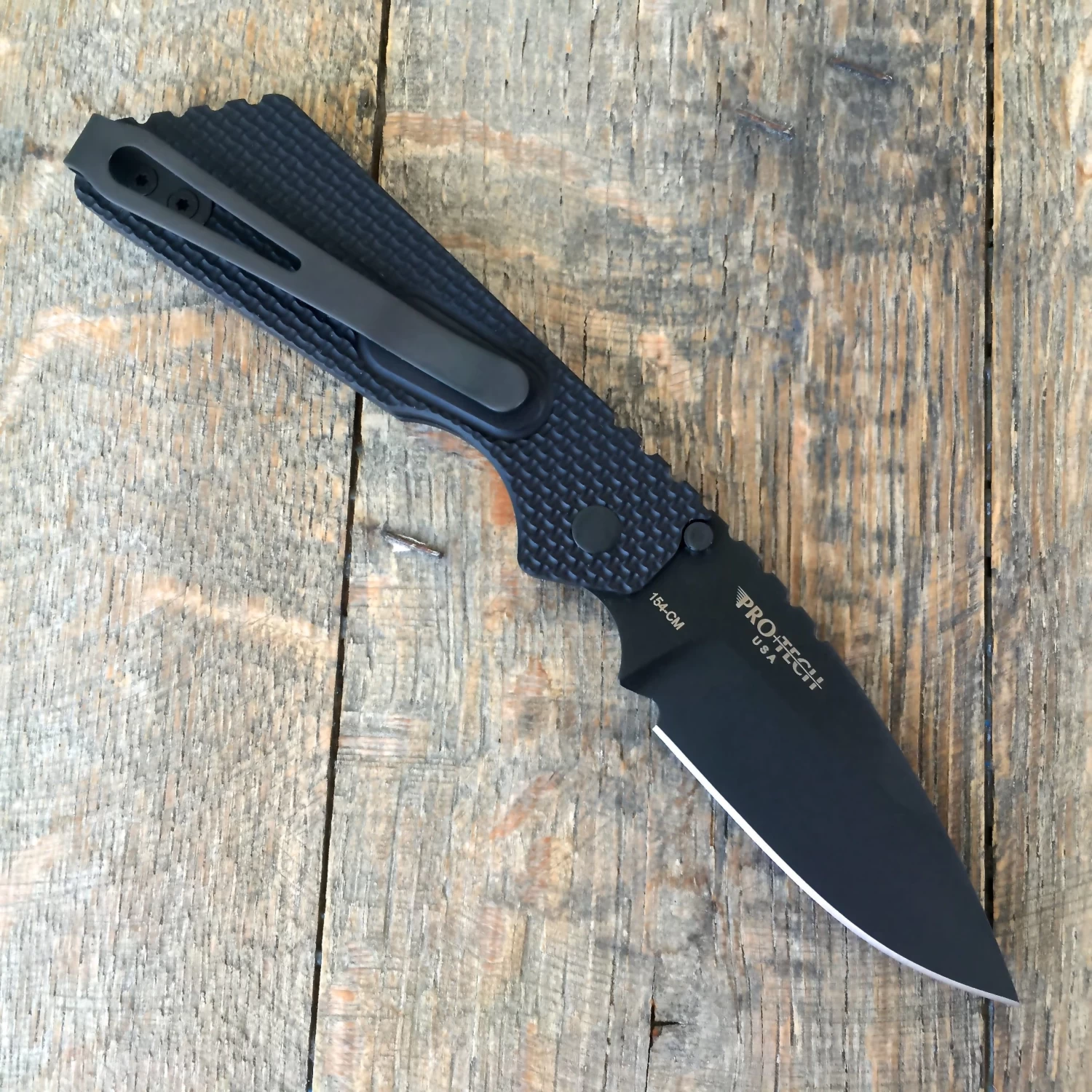 This Strider/Protech PT auto is equipped with a black handle with “Super Grip” knurling and a black finished blade. This Protech Strider collaboration revitalizes their popular SnG automatic model with a compact EDC design. The Strider inspired profile remains the same, but the handle and blade have been scaled down to a more pocket friendly size. Black hardware and a black deep carry pocket-clip round out the impressive EDC design.