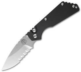 This version of the Protech SnG knife has a solid, smooth 7075 aluminum handle with a black hard coat anodized finish. The blade is stonewashed 154-CM stainless steel with a partially serrated edge. And, keeping true to the original, the SnG Auto is outfitted with a Strider titanium pocket clip.